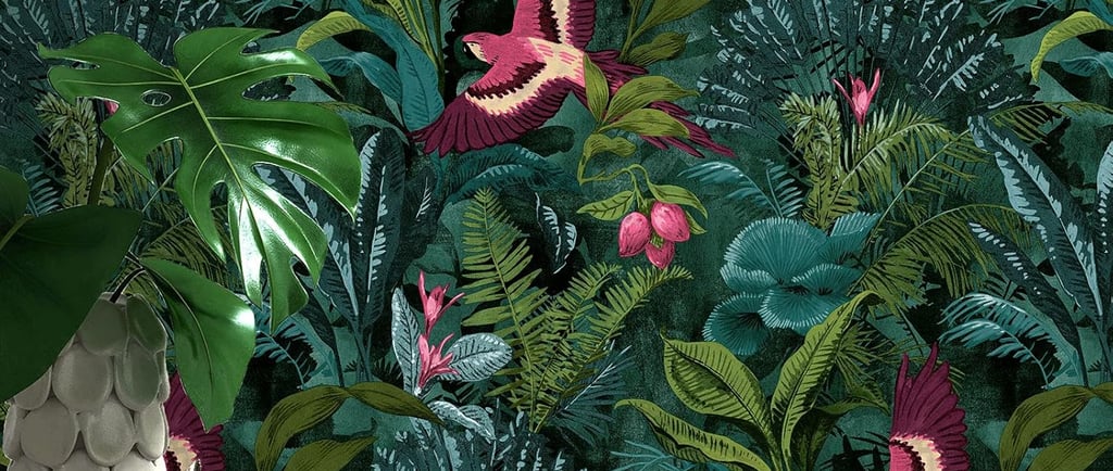 Tropical, colourful and rich statement design that brightens up the room. This one turns any wall into a conversation piece and feels luxurious, bold happy, without being overpowering.